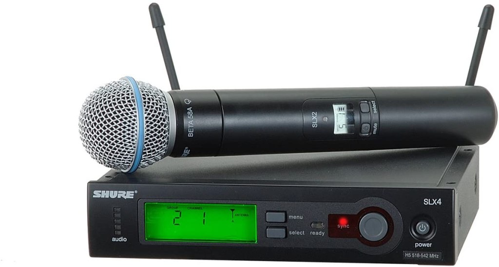 Draadloos microfoonsysteem met de SLX4 ontvanger, SLX2 handzender Met beta 58a dynamisch kapsel. De micro heeft een automatische frequentiekeuze en zendersetup, op die manier is er steeds perfect geluid zonder ruis en storingen.
